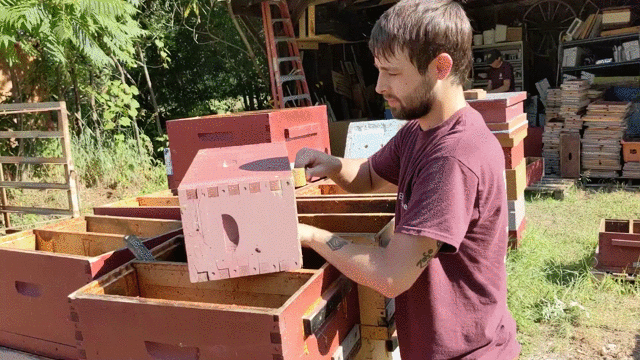 Once the hive has been reassembled, check to see that all the boxes are even and square with each other. Without the previous propolis seals, you can use the flat blade of the hive tool to lever the boxes into perfect alignment. Although this seems like a picky step, it prevents the development of ridges of propolis that can eventually create gaps between the boxes.