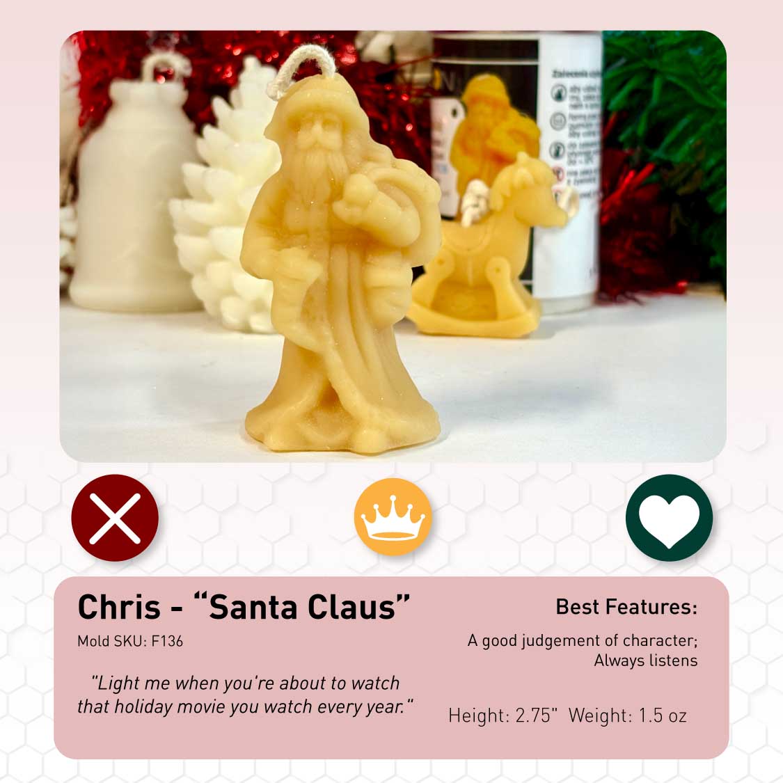 We don't know if burning Santa Claus candle mold candle puts you on the naughty or nice list, but we do know that, based on a trip we made to the North Pole, this candle is a spitting image of Santa himself