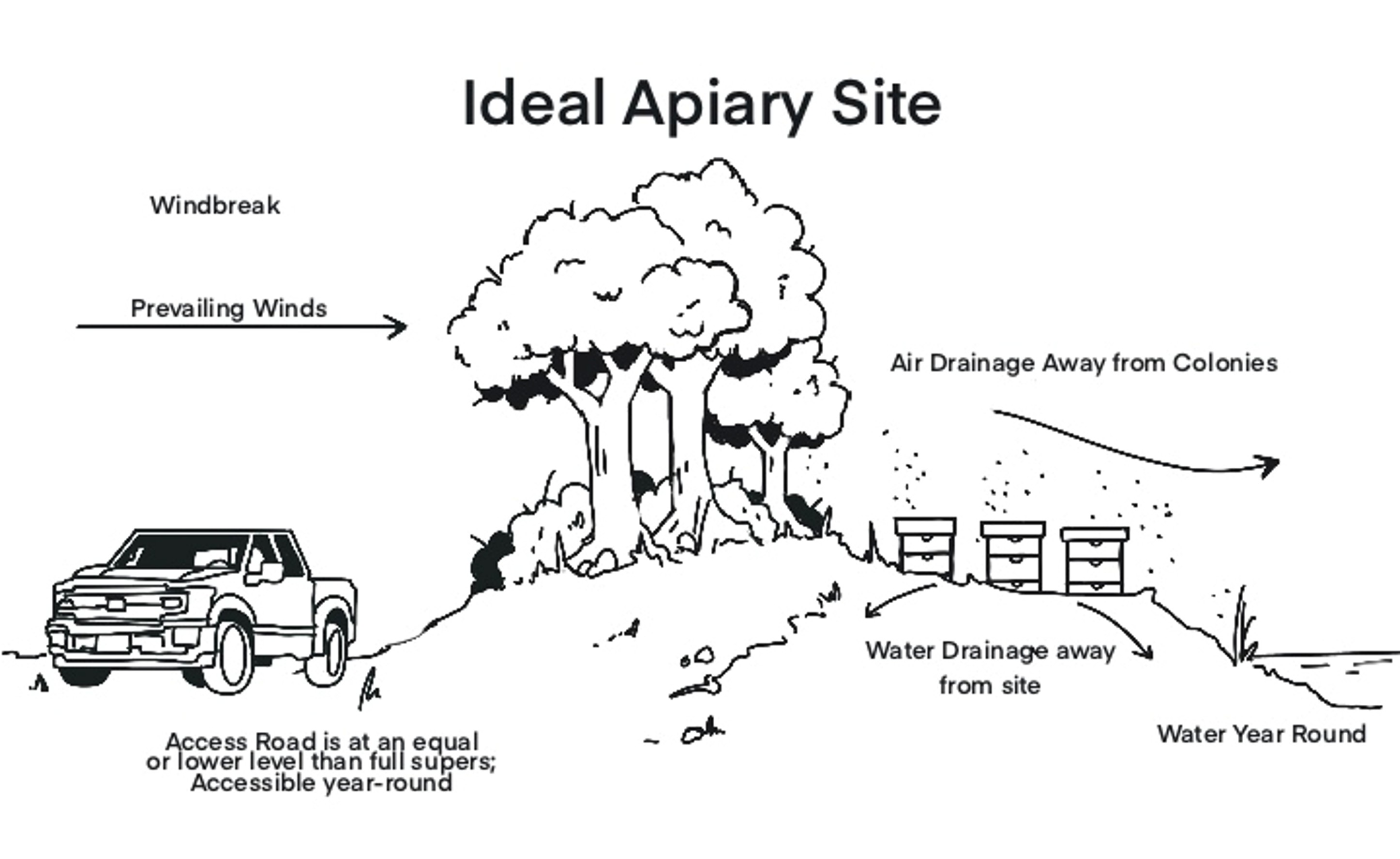 The best place to put your hives is in an area that's easy for you to access. At some point, heavy honey will be moved from the hives to your house. Will that be done using a truck, car, wheelbarrow?