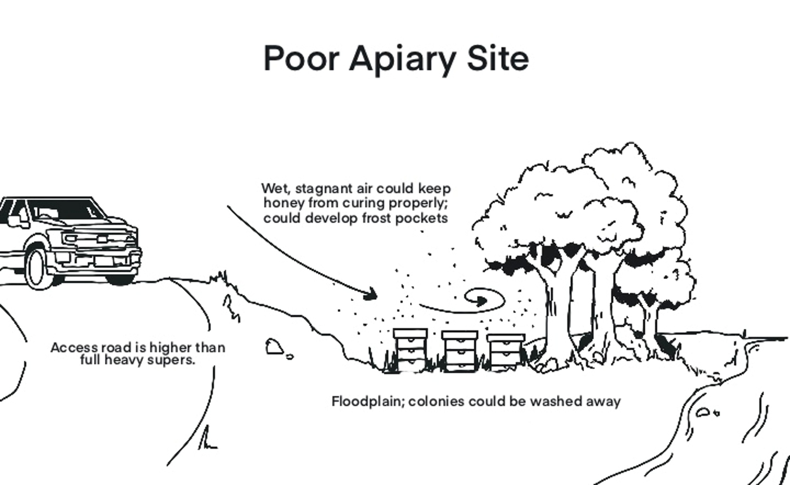 Even if you live out in the country, place the hive in a spot where you can at least glance at it daily. A fallen tree, bear, or wind could knock a hive cover off - or tip a hive over. Avoid the temptation to set up hives out of sight at the far edge of your hayfield.