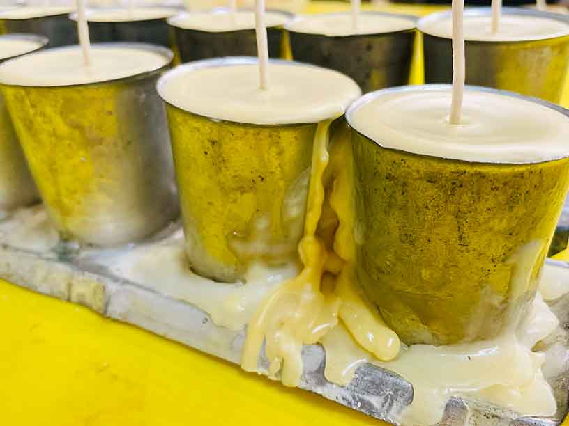 Keep in mind: don't worry about overpouring. As long as the mold has been filled, it won't matter if extra wax drips down the outside. Just use a waxed surface to catch the spill. At Betterbee, we save all sorts of packaging material for this purpose. All of these drips, spills, and mispours can be dumped back into the wax melter to turn back into liquid wax for another try.